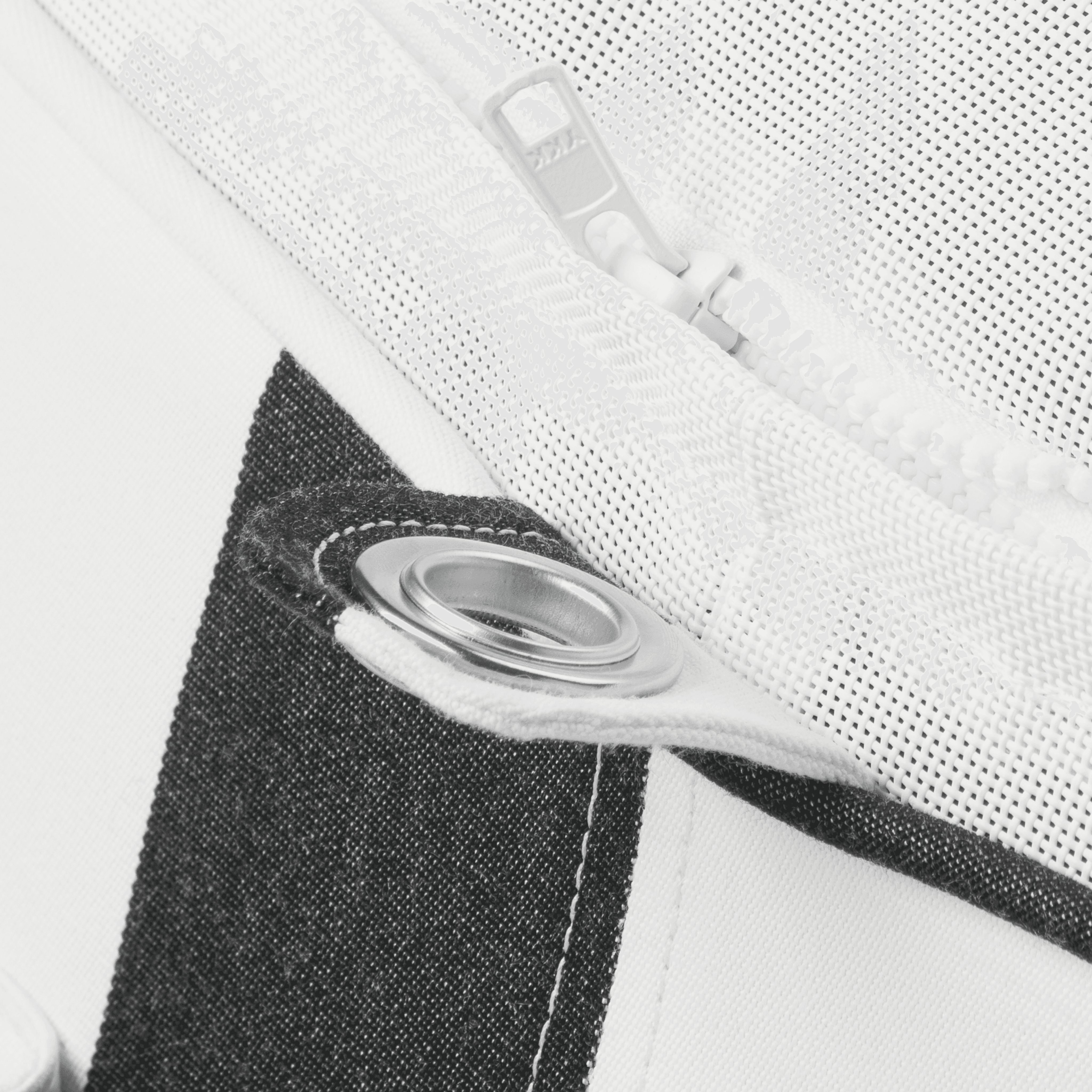 Marine-grade zipper in matte white enamel finish, for corrosion resistance and colorfastness.