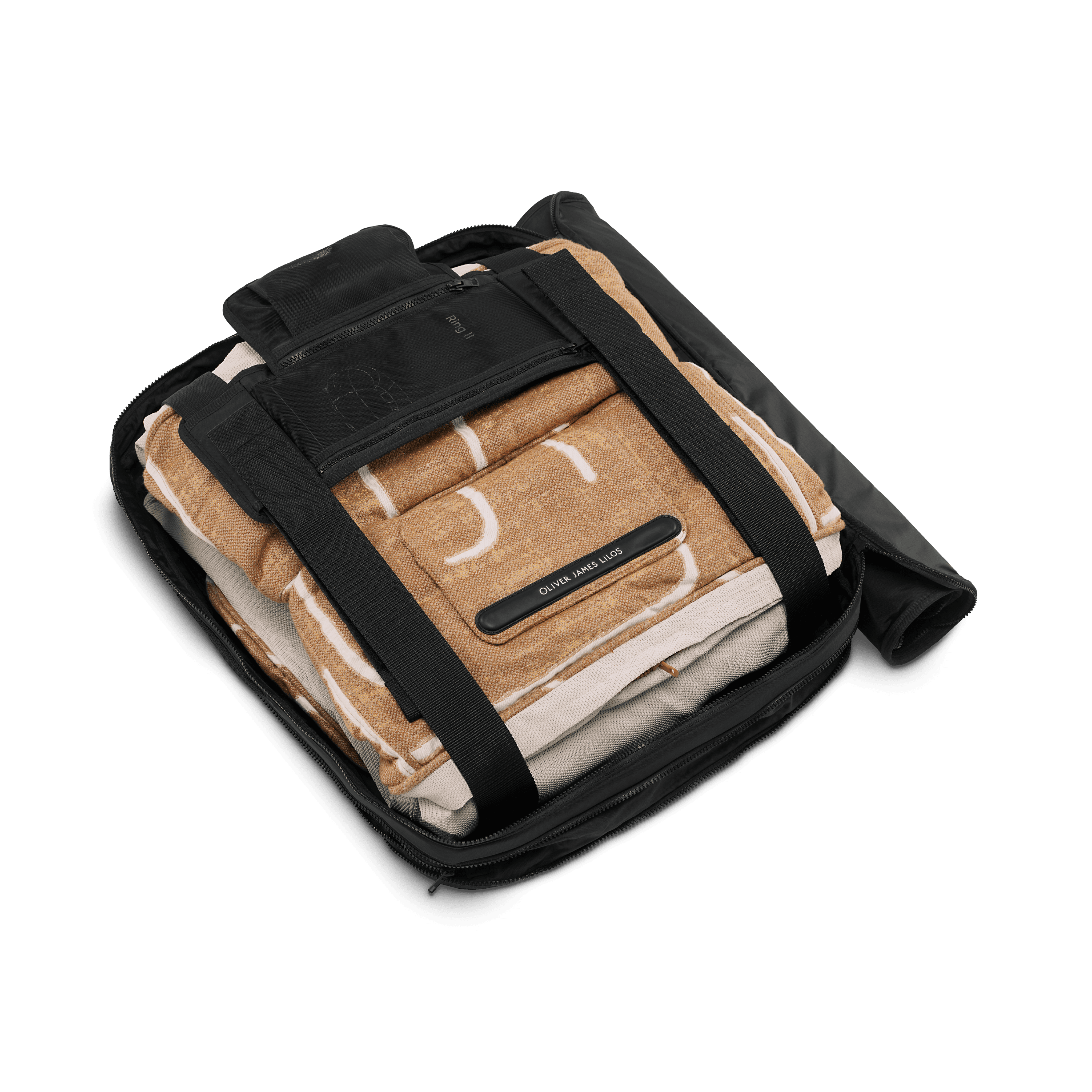Richly golden and thick in texture. Maze is the largest repeating pattern ever applied to a Lilo, custom woven using gold warps and heavy brown weft, toned with white and orange yarns. Complemented with gold stainless eyets, beige base, brown zipper and gold trim.