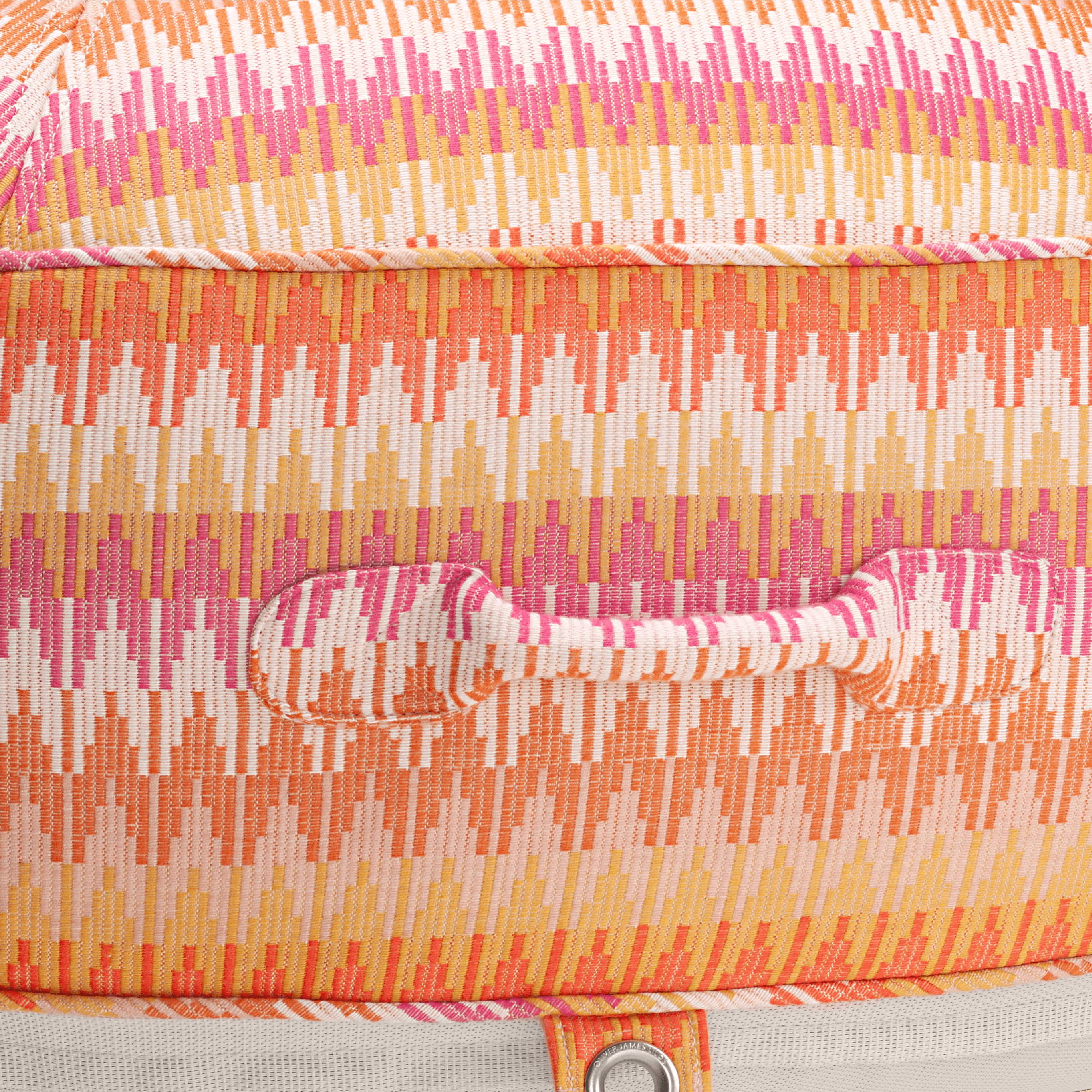 Made with Valley, a richly-coloured complex weave in pink, orange, yellow, and beige from Sunbrella®.